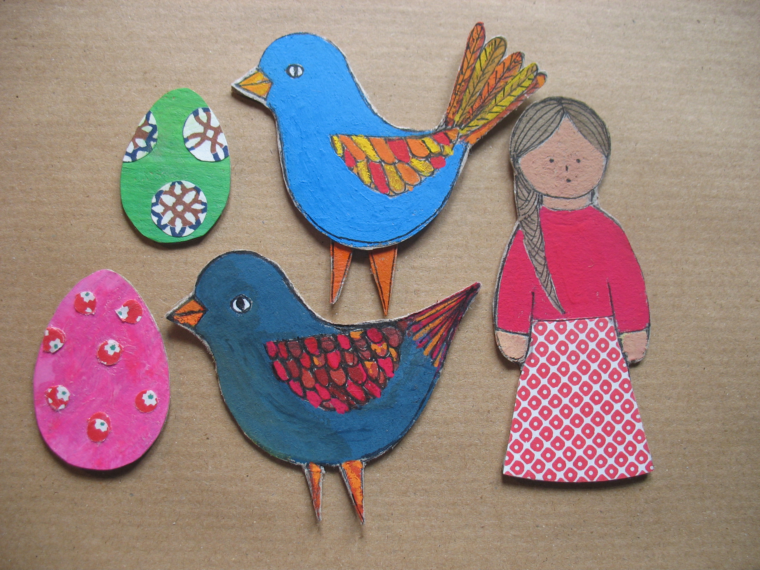 Then I couldn’t stop… cardboard and paint and pen are addictive it seems! Soon I had the whole cast and props of ‘The Nest’ – this time in technicolour